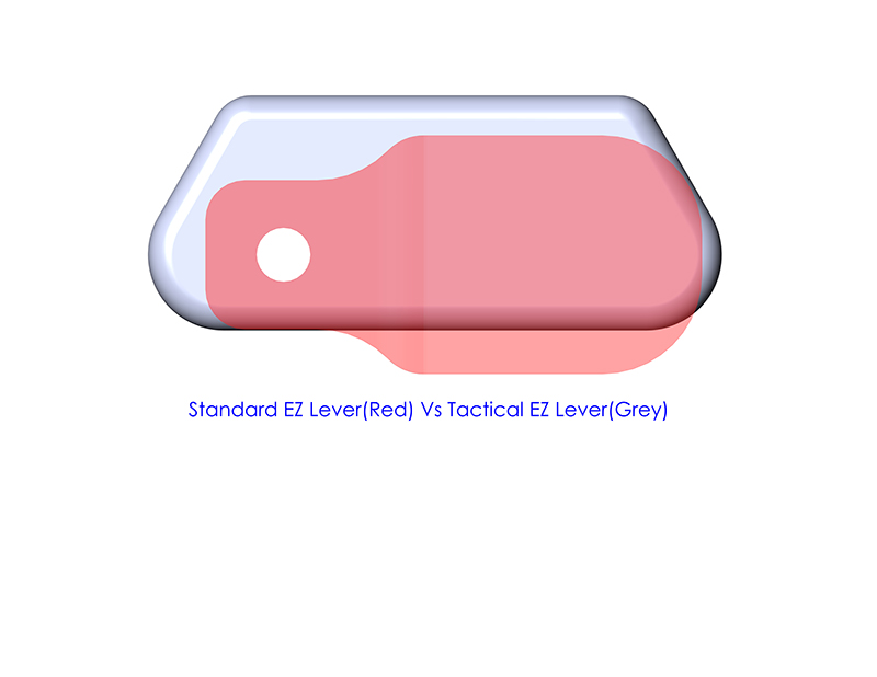 The tactical lever is about the same size as our original lever, but offset upward allowing more clearance for quad loading.