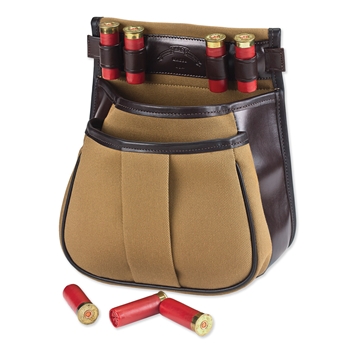 - The Sporting Clays Shell Pouch has a main pocket that holds 50 shells and a secondary front pocket for miscellaneous items. It is constructed of canvas cotton twill, lined with a water resistant nylon, gusseted and trimmed in rich dark havana Sauvage leather for added strength. Four adjustable loops are provided for additional shells.